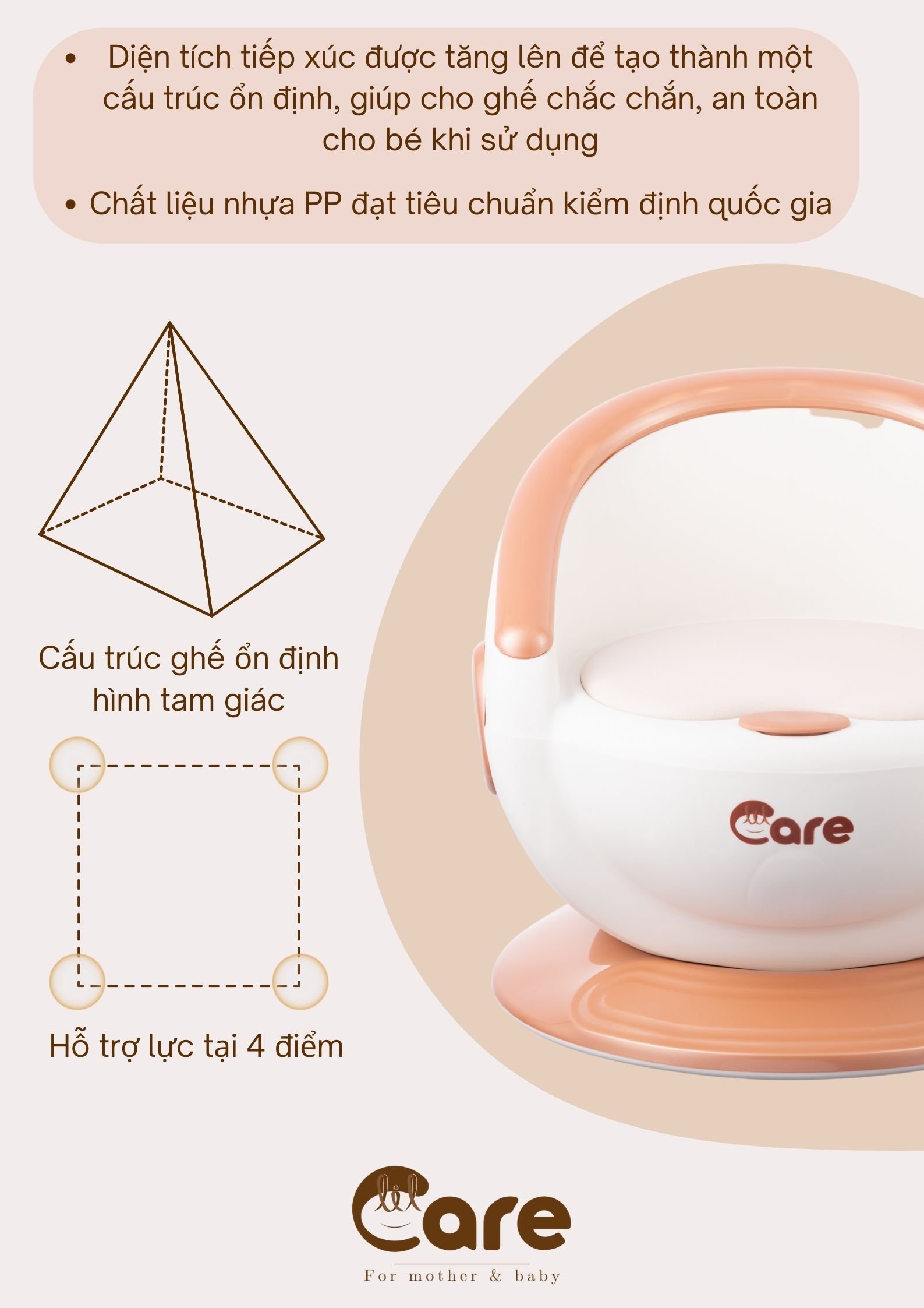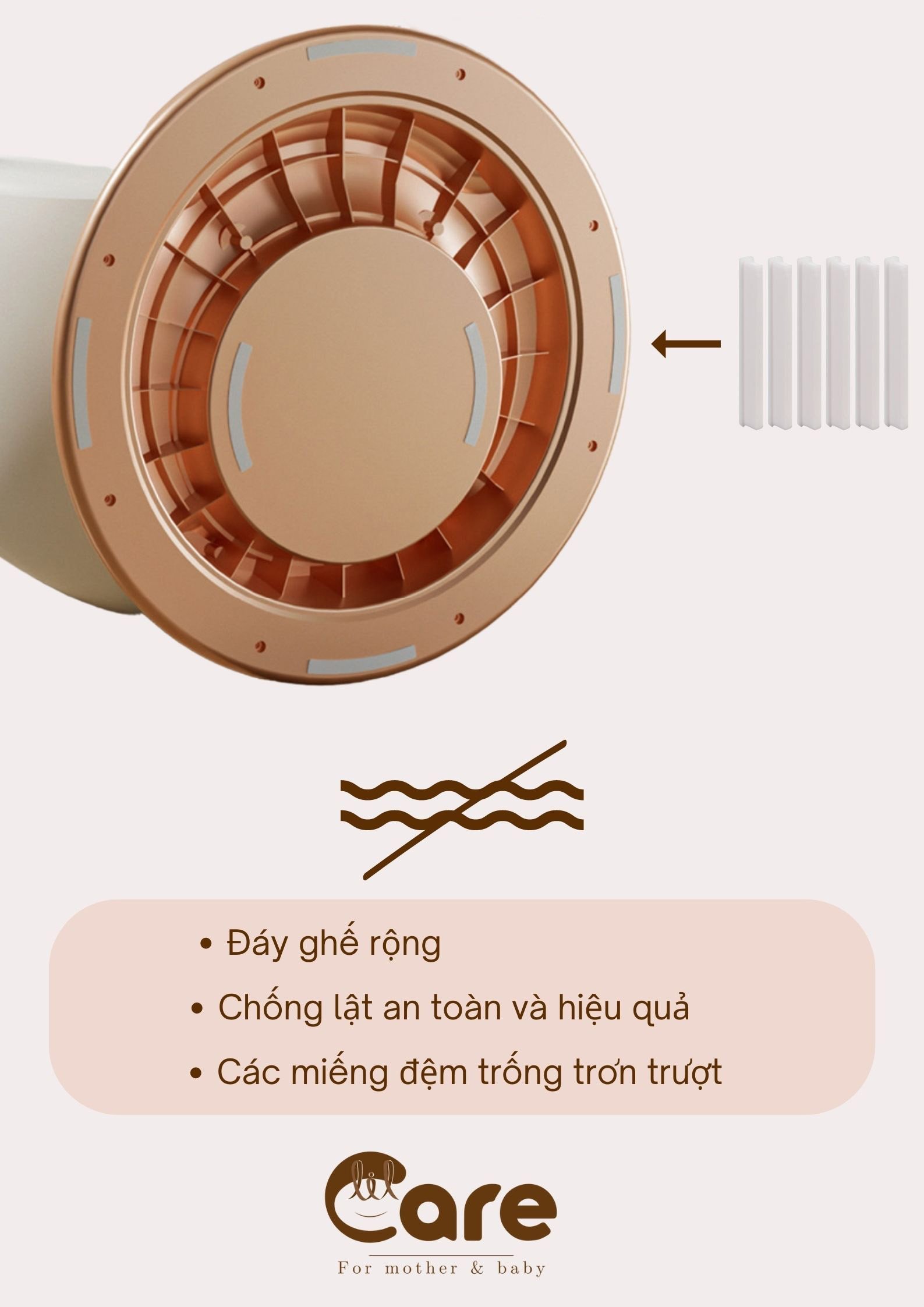 -Đáy ghế rộng, diện tích tiếp đất rộng có tác dụng chắc chắn, chống lật, an toàn cho bé.