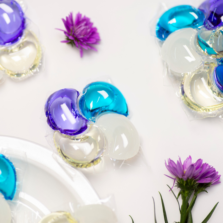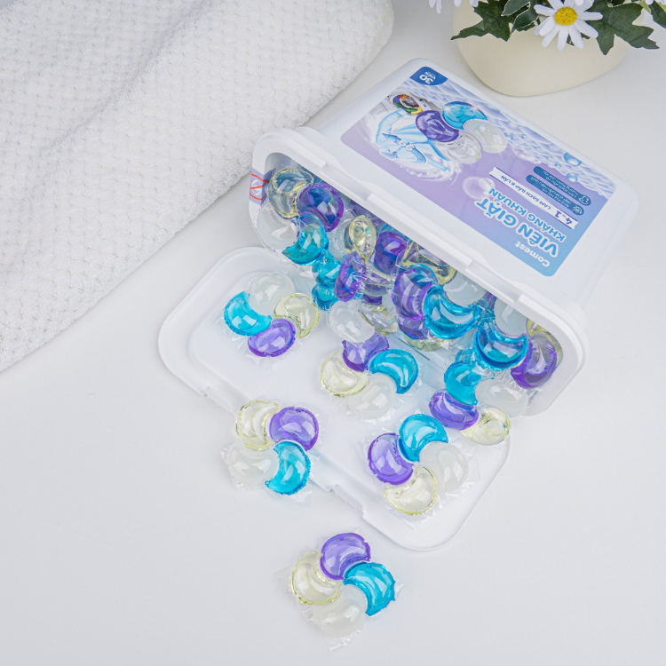 (Không cần xóa bỏ lớp màng ngoài của viên giặt. Lớp màng này sẽ tự tan trong quá trình giặt)