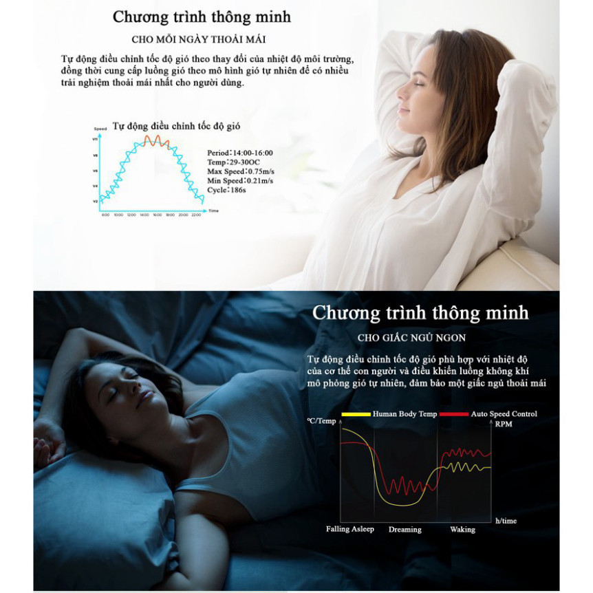 - Chương trình ngủ thông minh: Tự động điều chỉnh tốc độ gió phù hợp với nhiệt độ của cơ thể con người người và điều khiển luồng không khí mô phỏng gió tự nhiên, đảm bảo một giấc ngủ thoải mái