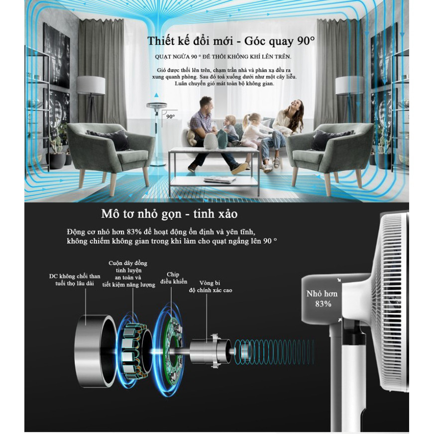 - Mô tơ nhỏ gọn tinh xảo: Động cơ nhỏ hơn 83% để hoạt động ổn định và yên tĩnh, không chiếm không gian trong khi làm cho quạt ngẩng lên 90 độ.