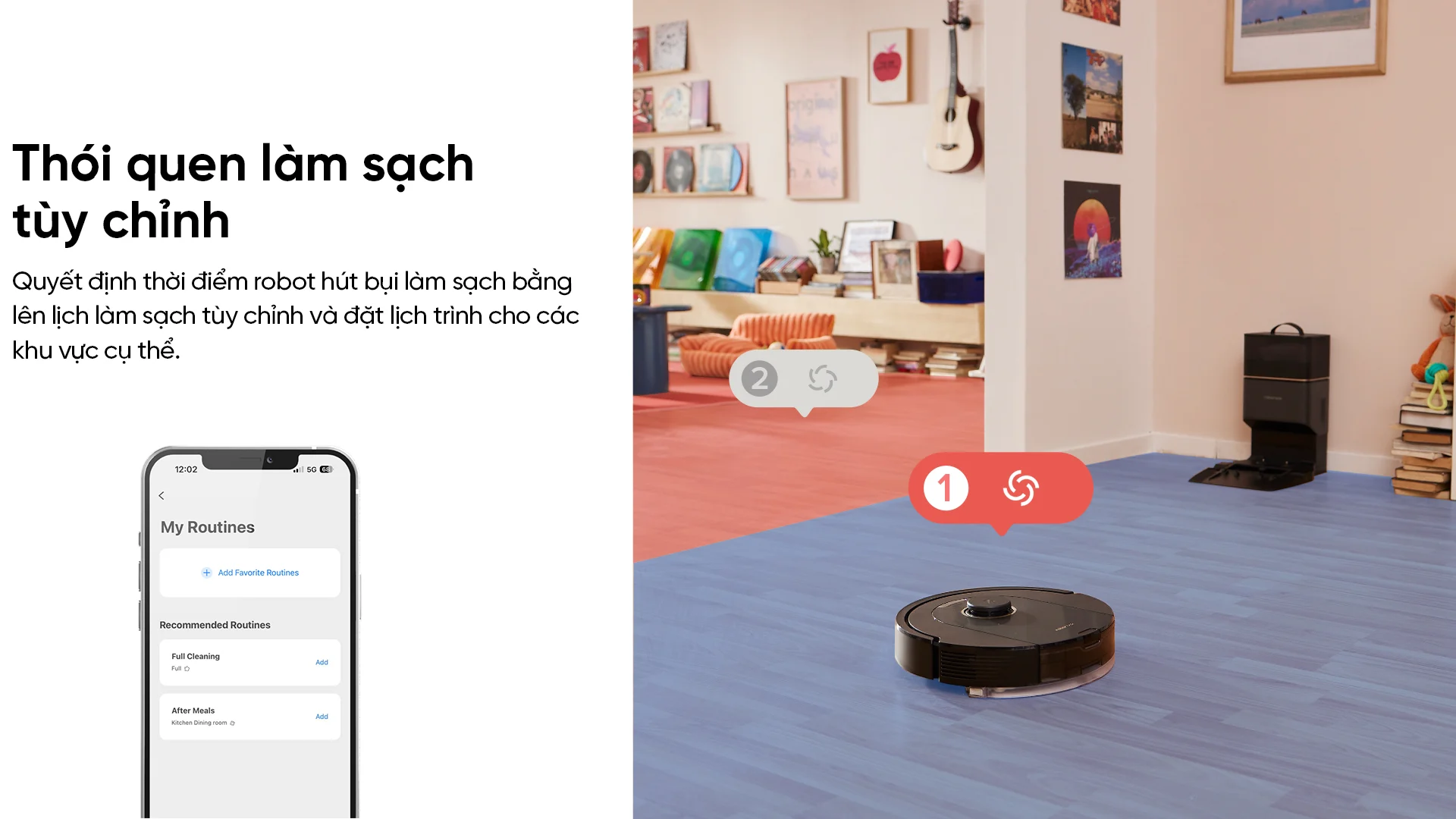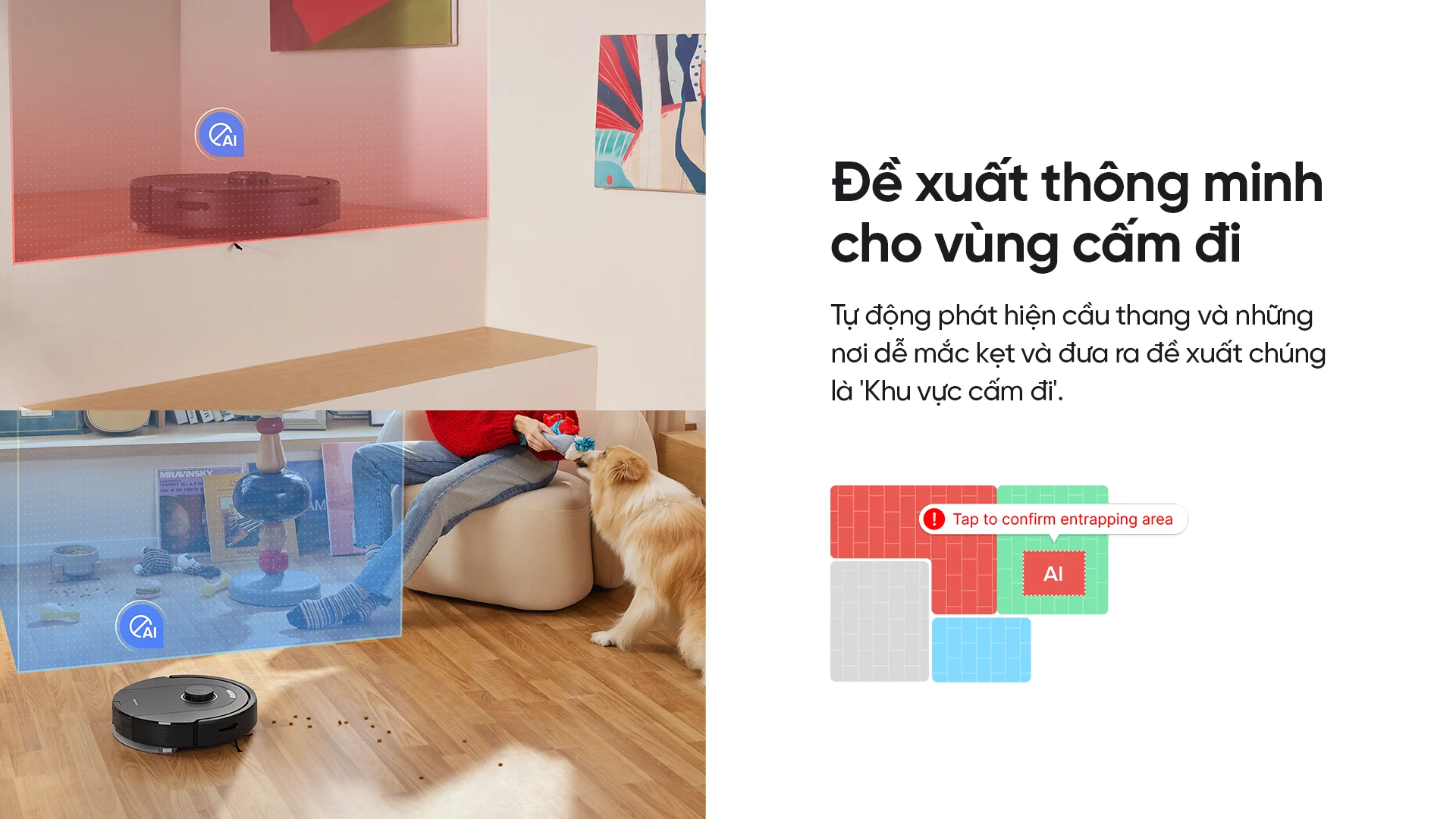 - Đề xuất thông minh cho khu vực hạn chế di chuyển: Tự đồng điều hướng để Robot tránh các khu vực dễ mắc kẹt khi di chuyển và đưa ra đề xuất cho các khu vực hạn chế đi vào. Tạo nên bức tường ảo ngăn Robot đi vào các khu vực nhất định thông qua Roborock App.