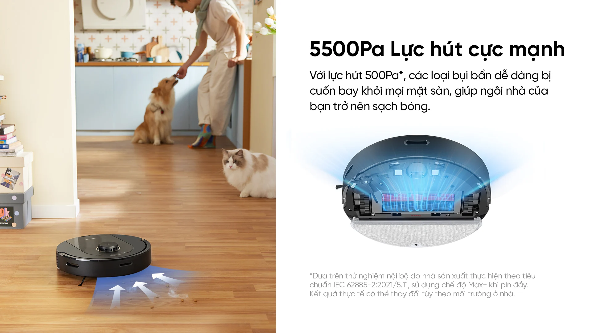 - Lực hút cực mạnh 5500Pa: Với lực hút 5500Pa, các loại bụi bẩn dễ dàng bị cuốn bay khỏi mọi mặt sàn, giúp căn nhà của bạn trở nên sạch bóng.