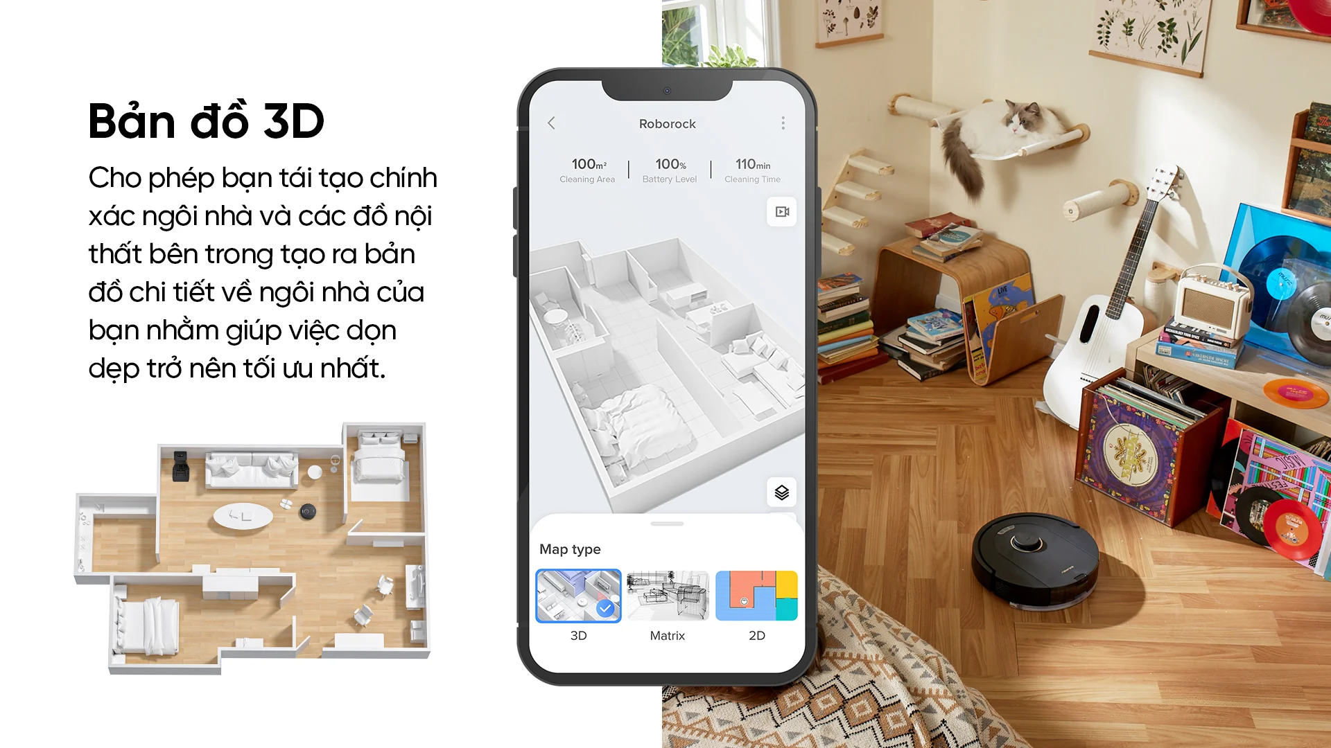 Bản đồ 3D cho phép bạn tái tạo chính xác ngôi nhà của mình và các đồ nội thất bên trong để xây dựng bản đồ chi tiết về ngôi nhà của bạn, nhằm đảm bảo việc dọn dẹp trở nên tối ưu nhất